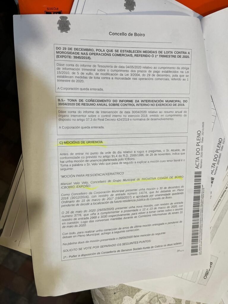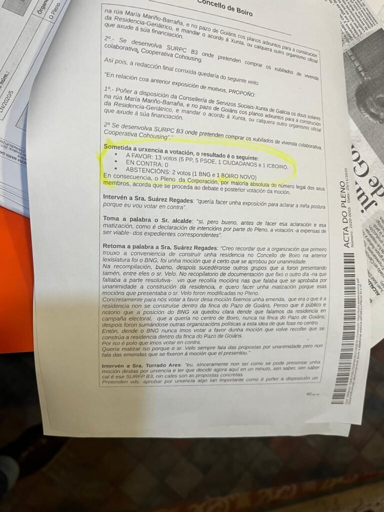 Os alcaldes prometieron facer a residencia nas campañas electorales desde hai 20 anos. Aque está a Acta do Pleno donde foi aprobado por estes terrenos, donde se quitou esta foto, para vedar a Xunta este solar para a Residencia pero o Alcalde Martiño non puso os terrenos a disposición da Xunta como era a sus obriga. Preferiu derrumbar a Casa de Cultura sin que nadie o pedirá, e gastar 5.000.000 E que mellor sería empléalos en facer Residencia. Nota da Asociación dos Xubilados de Boiro.